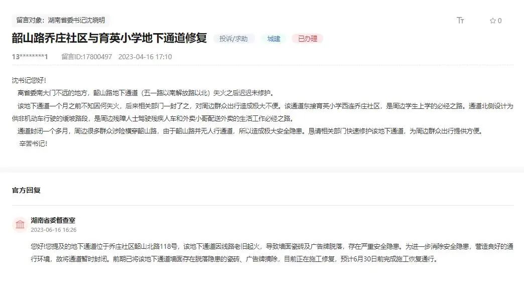 感到苦恼的不止田先生。2023年4月中旬,一条“恳请相关部门快速修复地下通道”的留言,被网友一键送至人民网“领导留言板”湖南省委书记沈晓明的“案头”。